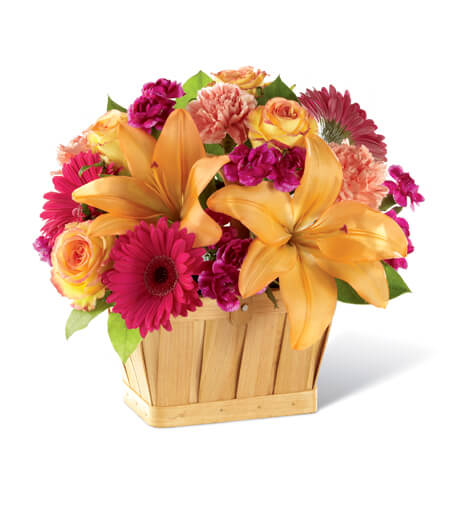This enchanting bouquet features bi-colored orange and yellow roses, peach Asiatic lilies, hot pink gerbera daisies, purple mini carnations, orange carnation, and lush greens. The arrangement is presented in a woodchip basket to create a perfect blend that will light up anyone's day.